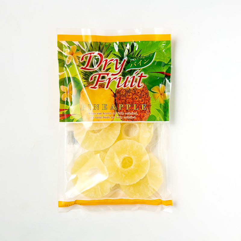 4540118021857 ドライフルーツ(パイン) ¥648(税込) 南国の太陽をいっぱい浴びたパイナップルを乾燥させたフルーツです。(タイ産です。) 名称 ドライフルーツ 内容量 180g 賞味期限 180日 C/S入数 20袋 商品寸法(mm) 280×170×25 ケース寸法(mm) 460×360×160